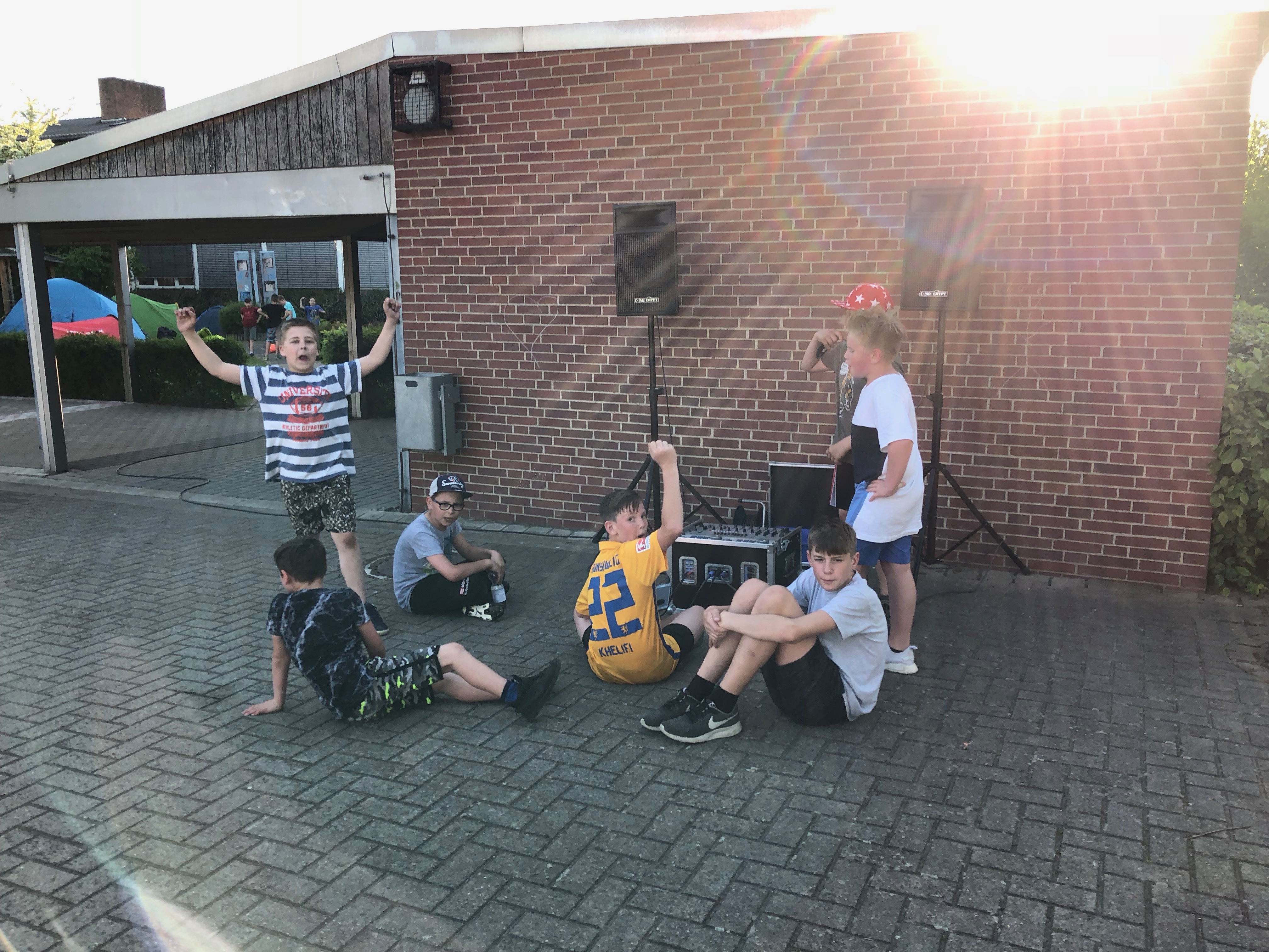 Alle IGS-Kids fanden sich wieder auf dem Schulhof ein, aus dem teilweise eine kleine Zeltstadt geworden war und wo aus den Lautsprecherboxen bereits die erstellte Musik-Playlist der DJs schallte. Eine Gruppe von Kindern half beim Aufbau des wieder reichhaltigen Buffets, das unsere tolle Elternschaft organisiert hat. Andere unterstützen beim Grill, spielten Federball oder richteten ihre Schlaflager weiter ein. Nach dem gemeinsamen Abendessen konnten die IGS-Kids noch einmal sportlich aktiv werden und bei einer Mini-PauLi (Pausenliga) das Runde ⚽️ ins Eckige bringen. Die ? hatten dieses Mal die Nase vorn.