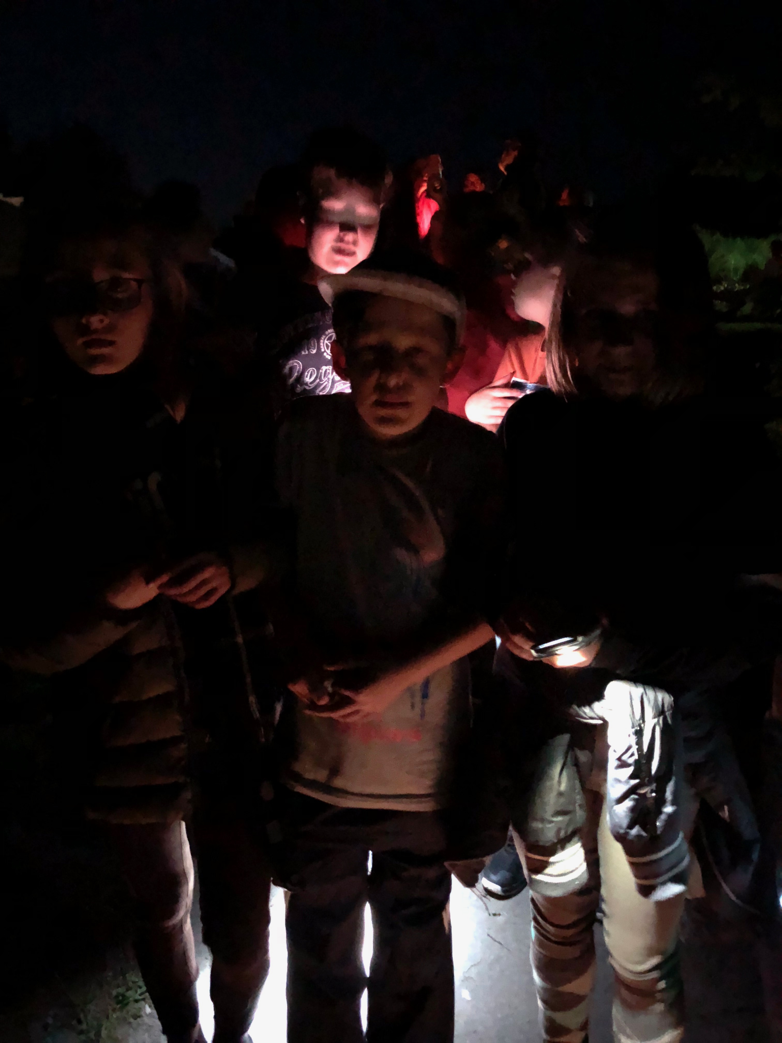 Als die Dunkelheit komplett eingebrochen war, machte sich der Jahrgang zu einer Nachtwanderung auf. Auf dem Weg durch die Dunkelheit gaben aufgestellte Kerzen den Kindern Orientierung und sorgten für eine leicht gruselige Stimmung. Alle Kinder haben sich auf das Erlebnis eingelassen und waren stolz über das Geschaffte.