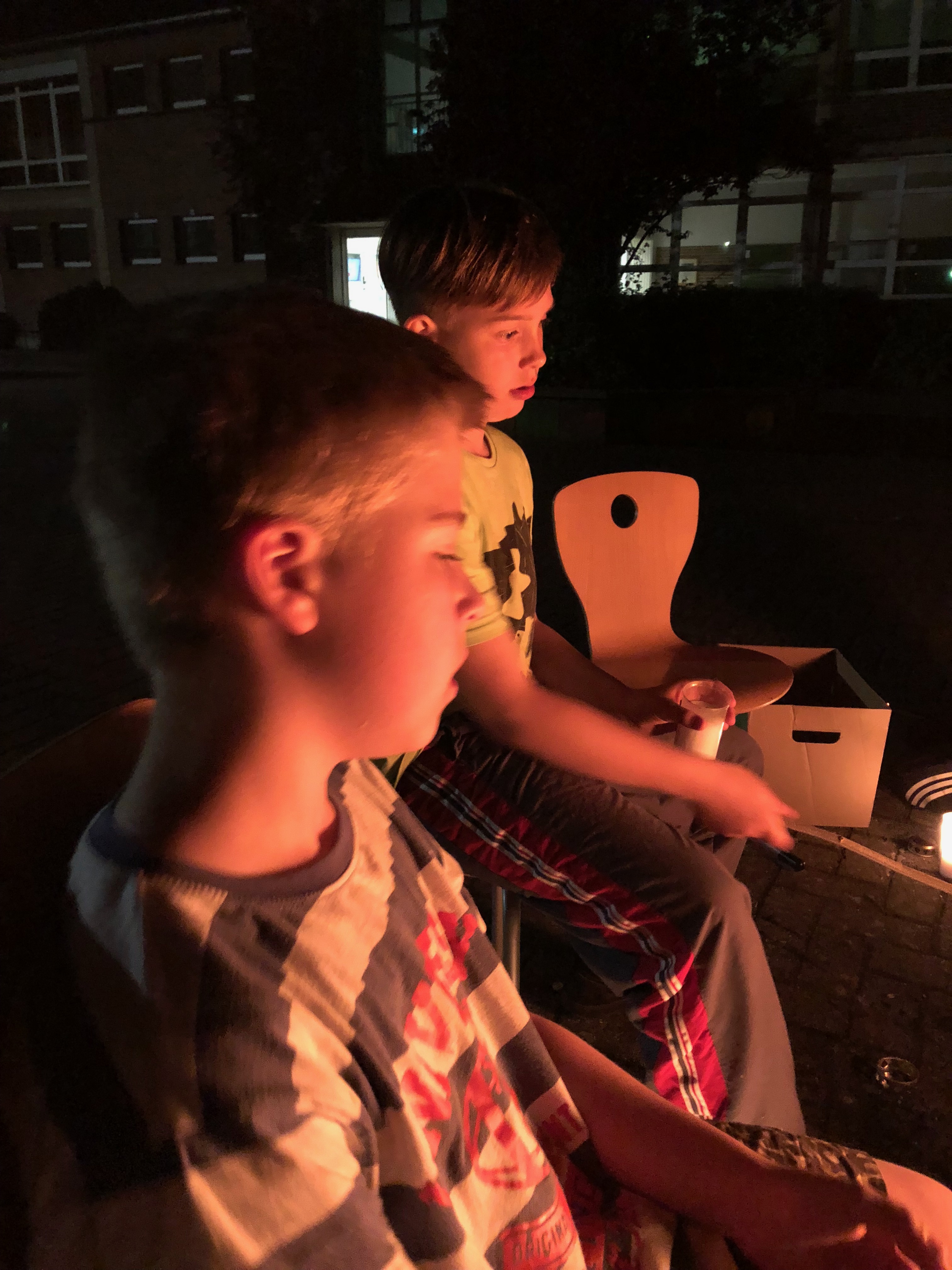 Bei Einbruch der Dämmerung wurde das Holz in der Feuerschale entzündet und der Schulhof wurde durch die Silhouette der Zelte in Sommerlager-Atmosphäre getaucht. Als noch Stockbrotteig und Marshmallows in der Runde verteilt wurden, war die Lagerfeuer-Szenerie perfekt und alle genossen diese besondere Stimmung.